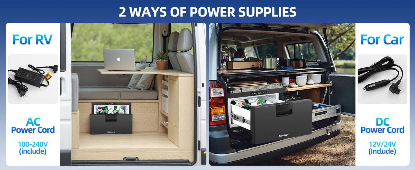 ⚡ Included Dual Power Options – Works Anywhere Adapters included ✔ 12V/24V DC plug – connects to car/truck/RV power outlets. ✔ 110V AC adapter – switch to home power when parked.