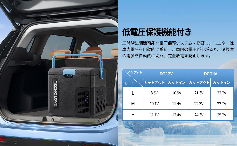【安心保証&パッケージ内容】Tecnoloveの車載冷蔵庫はすべて安心保証付きです。ご購入日から24ヶ月以内、何か不具合や初期不良などがございましたら、ぜひメールにてご注文番号添付してご連絡ください。確認次第、素早くご対応いたします。パッケージ内容:家庭用ACアダプター1.5M*1、車載用DC電源コード2.5M*1、日本語説明書x1