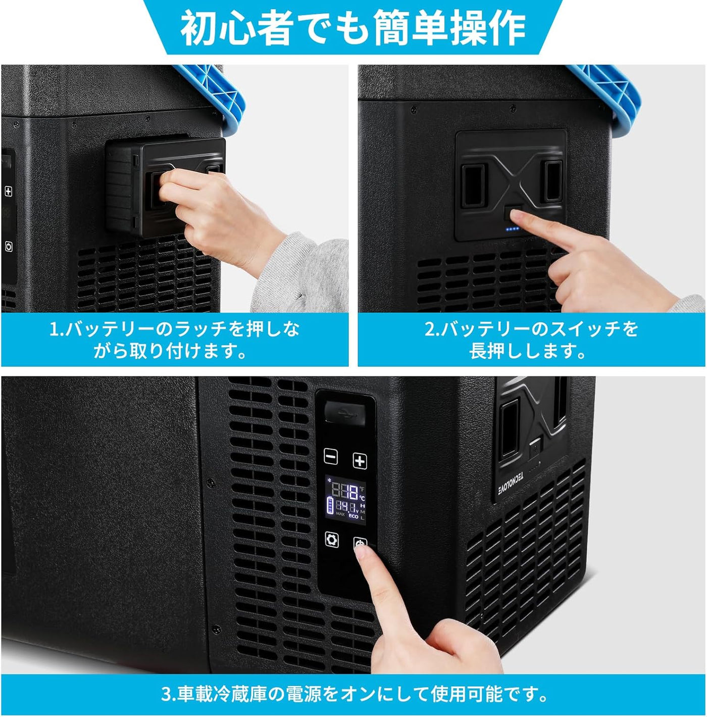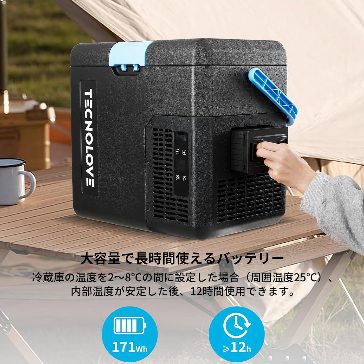 【大容量で長時間使える】このバッテリーの容量が15600mAhで電力量が173Whです。 冷蔵庫の温度を2〜8℃の間に設定した場合(周囲温度25℃)、内部温度が安定した後、12時間使用できます。ドアの開け閉めの回数による時間が変わることがあります。別売りの専用バッテリーを取り付けることで、庭や海辺、キャンプ場などの電源のない場所でも使用できます。アウトドア活動や長時間の滞在中も、一日中快適にご利用いただけます。
